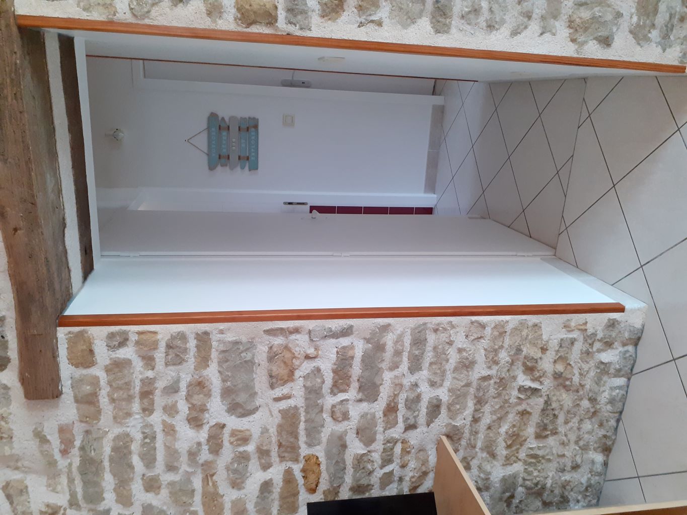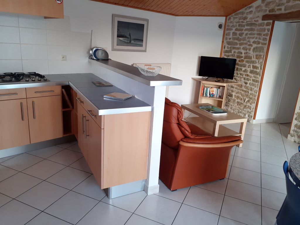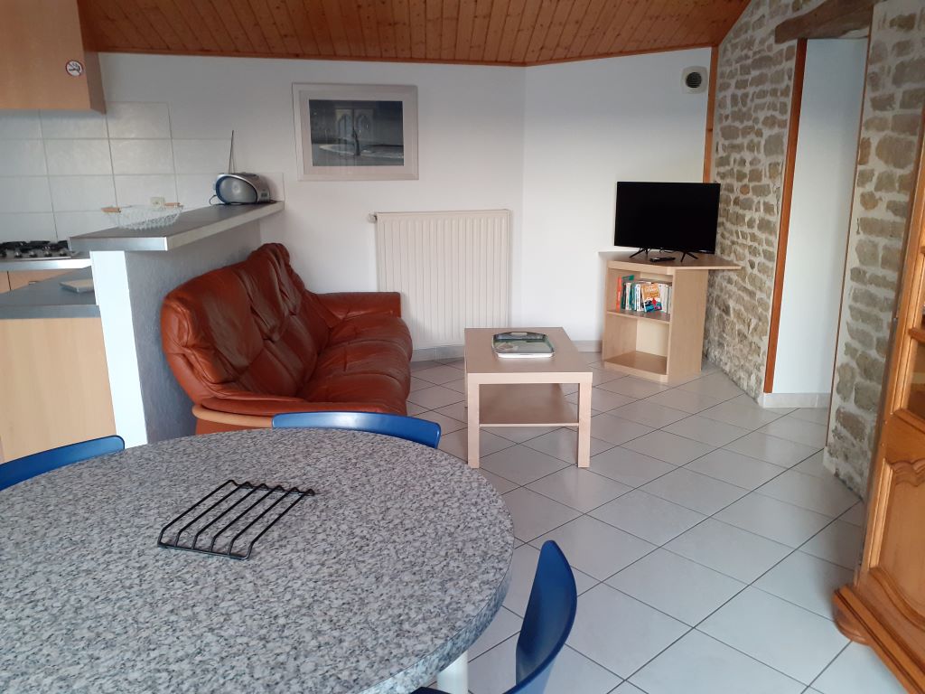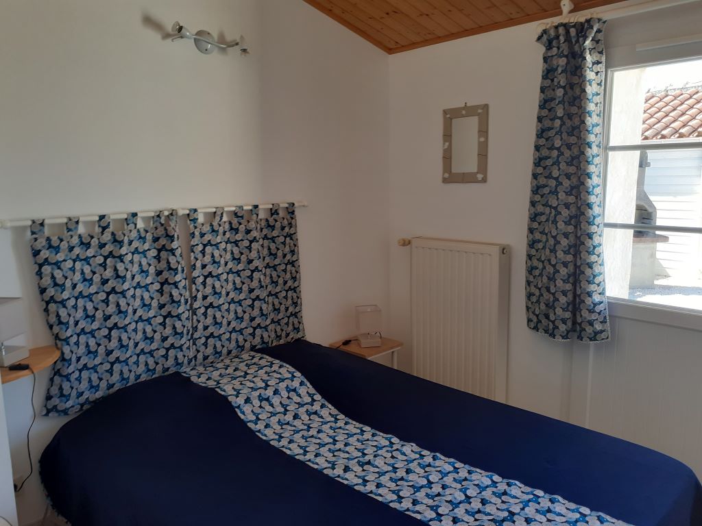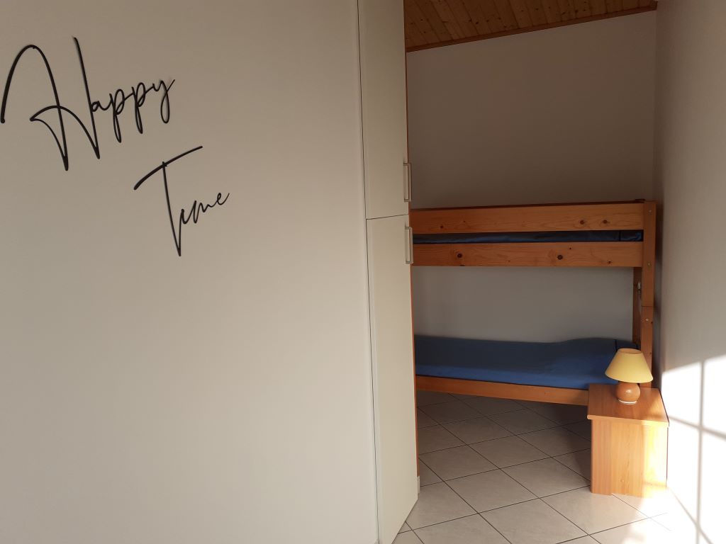 En rez-de-chaussée séjour/salon/cuisine, salle d’eau, wc, deux chambres (1 lit 2 personnes + 2 lits de 1 personne superposés).