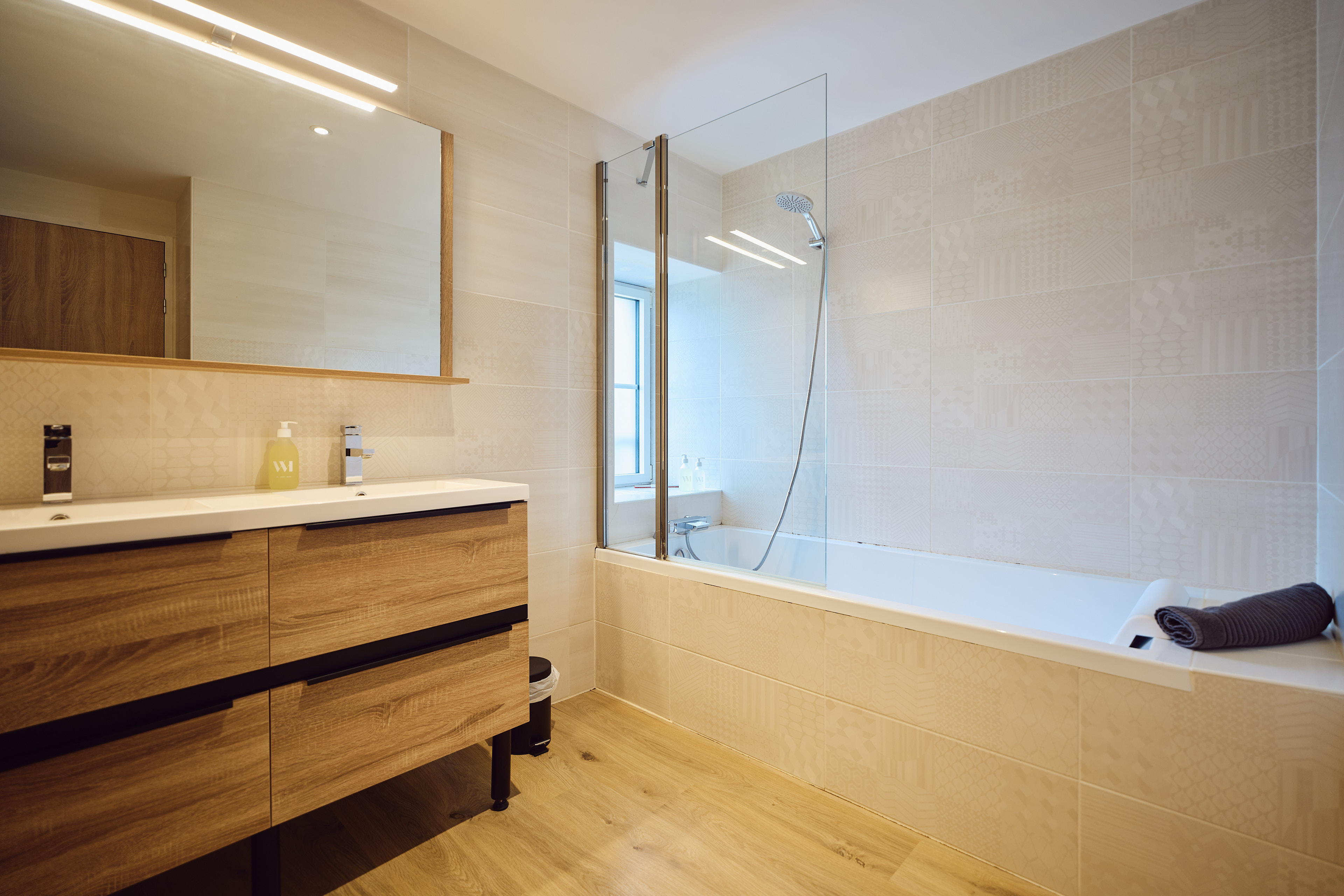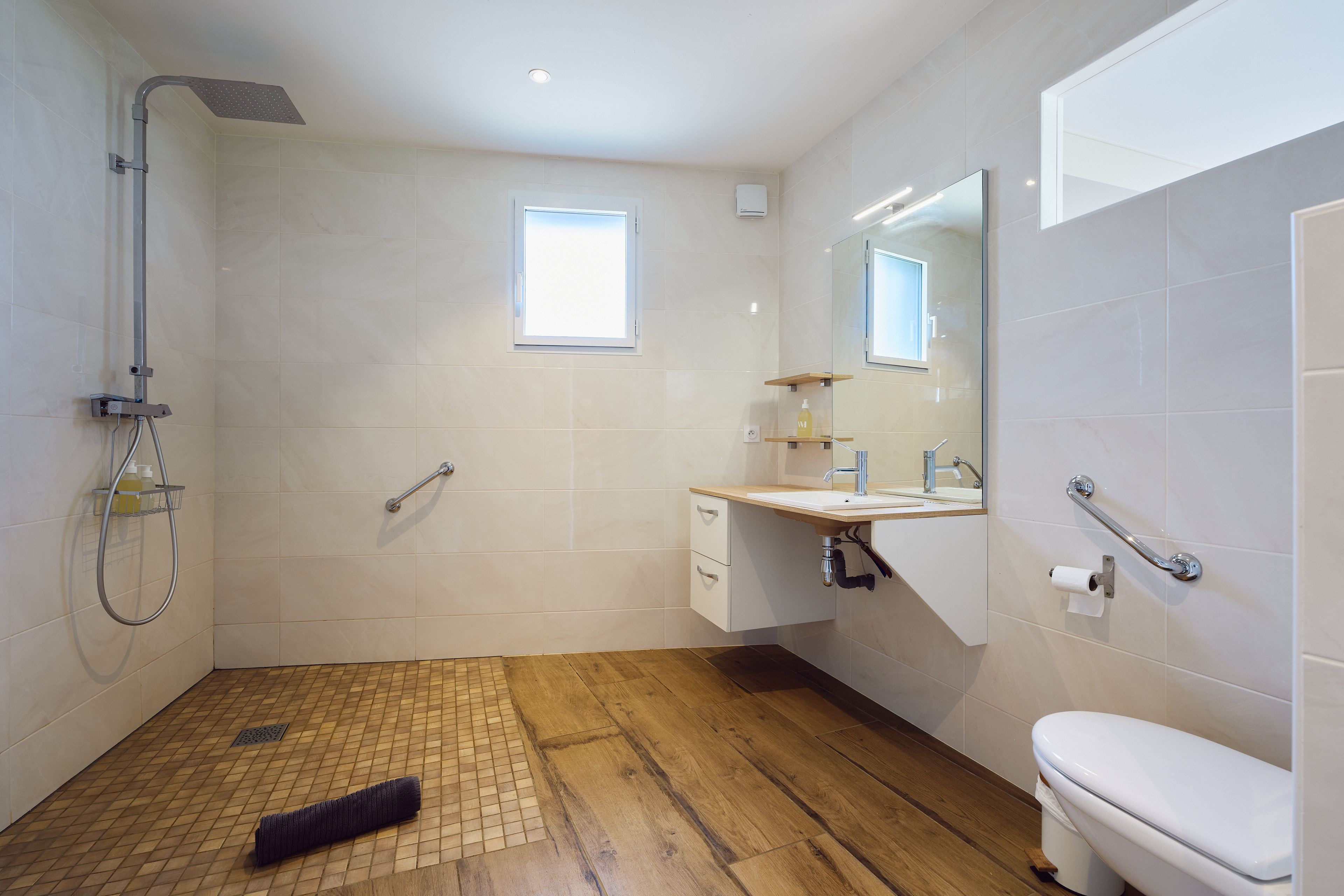 Au rez-de-chaussée, vous trouverez un espace de vie de 55m² avec cuisine et salle à manger, un salon, un vestiaire, ainsi que des wc indépendants. Également en rez-de-chaussée, une chambre, avec salle d’eau et wc privatifs, adaptée aux personnes à mobilité réduite.