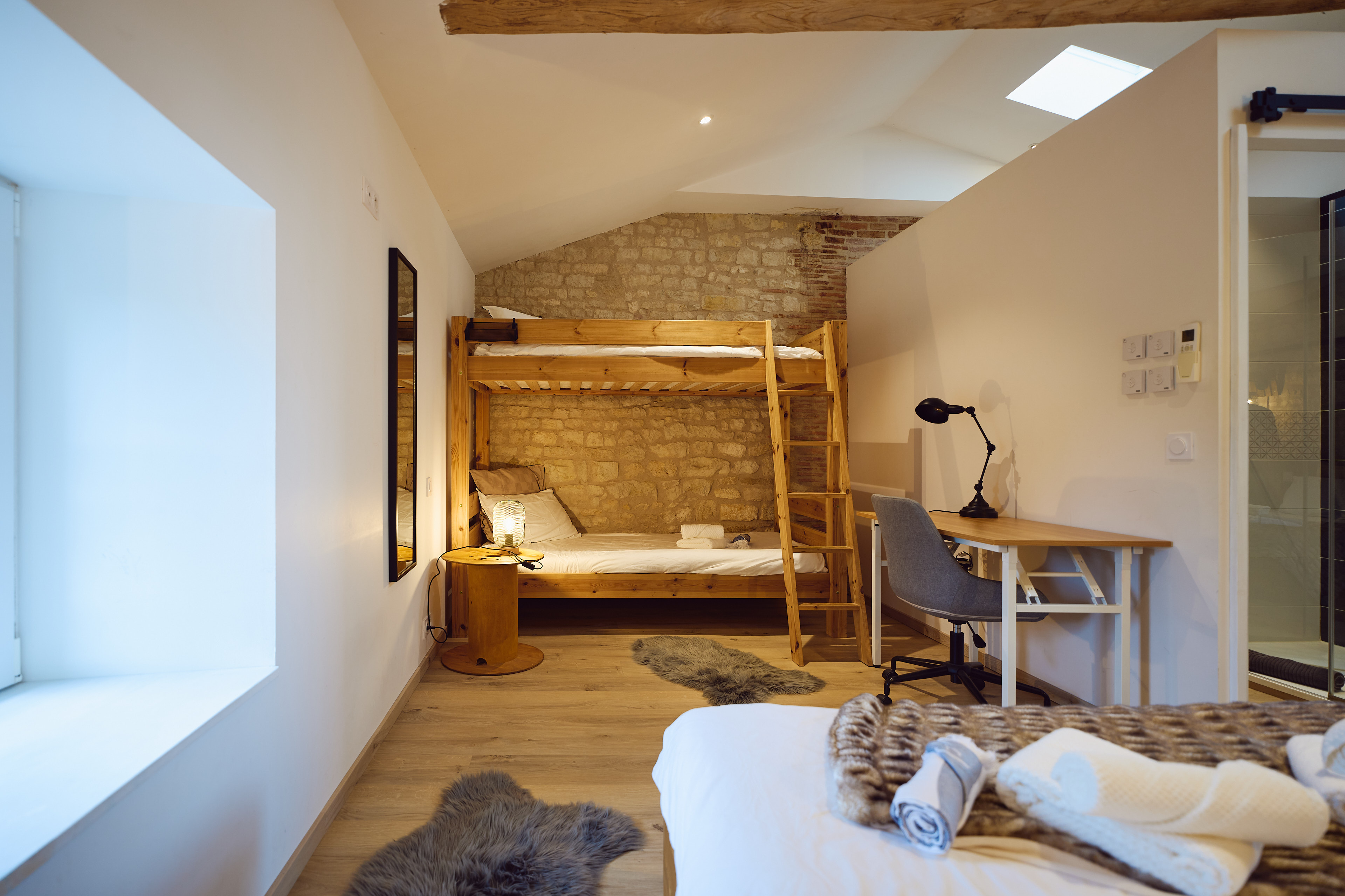 L’étage est composé d’une chambre parentale avec salle d’eau privative, de trois chambres, d’une salle de bain et de wc indépendants.